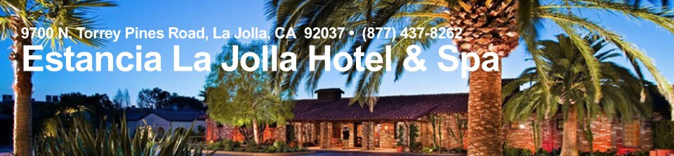 Estancia La Jolla Hotel & Spa is a San Diego hotel, day spa and conference center in Southern California just a short drive from world-class attractions, beaches and shopping. The hotel features elegantly appointed guestrooms, sophisticated meeting facilities, beautiful wedding receptions and several casual dining restaurants. Guests can enjoy a round of golf on the renowned Torrey Pines Golf Course, a sunset over the Pacific Ocean from the cliffs at Torrey Pines or a relaxing spa treatment at this hotel near San Diego.