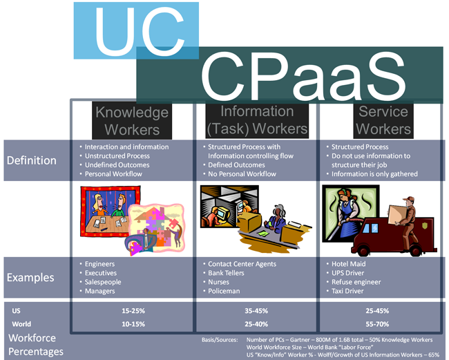 The first point of the discussion was that CPaaS is not UC. To better understand, UC can be characterized as integrating the range of communications modalities (voice, video, text, sharing) into the personal business process of collaborators in the enterprise. In the structure of Knowledge, Information and Service Workers (read a white paper here about how UC services apply to these groups), UC is primarily focused on the knowledge workers, while CPaaS impacts the information and knowledge workers. However, CPaaS can also impact customers and partners outside the organization.