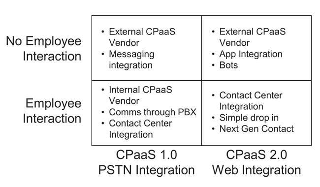 With this range of options for how to enable real time communications from applications, a new challenge Is emerging - which platform to use? The first choice is whether to use a PSTN-based communication or to use a web-based communications channel. The second is whether to use a solution provided by the enterprise communications platform or to use an independent third-party platform. The four choices, as shown in the figure below, should be driven by the communications requirements and who is communicating. If the communications are between employees or are predominantly involving an employee, using the enterprise communications platform may be best. On the other hand, if most of the communications is either with third parties or with employees away from a corporate location, a third-party CPaaS may be best. The choice of whether to use the PSTN or in-app web based communications is driven by a host of factors. If the customers will not download an app, then the PSTN/SMS may be best. If the app is downloaded on the user/customer device, then in app web communications may be best. If the communications require video, then the web in-app generally makes more sense.